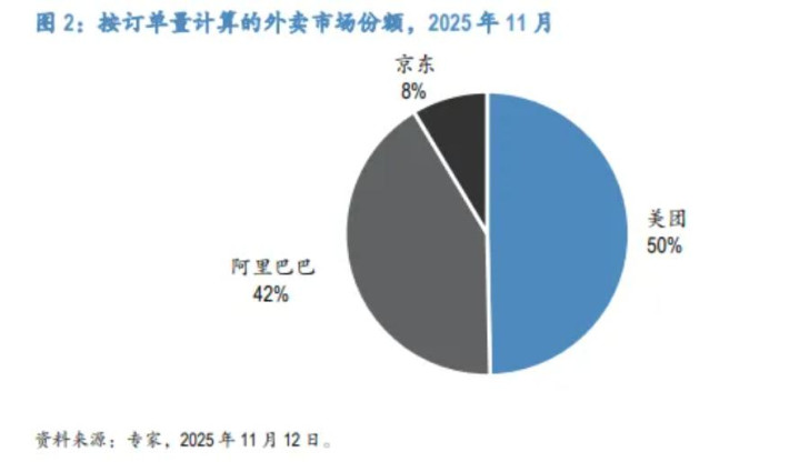 最后有媒体报道显示,2025年4月左右,美团与饿了么分别占据75%与25%的市场份额;到了2025年11月左右,美团份额缩至50%,阿里巴巴涨到42%,京东占据8%。