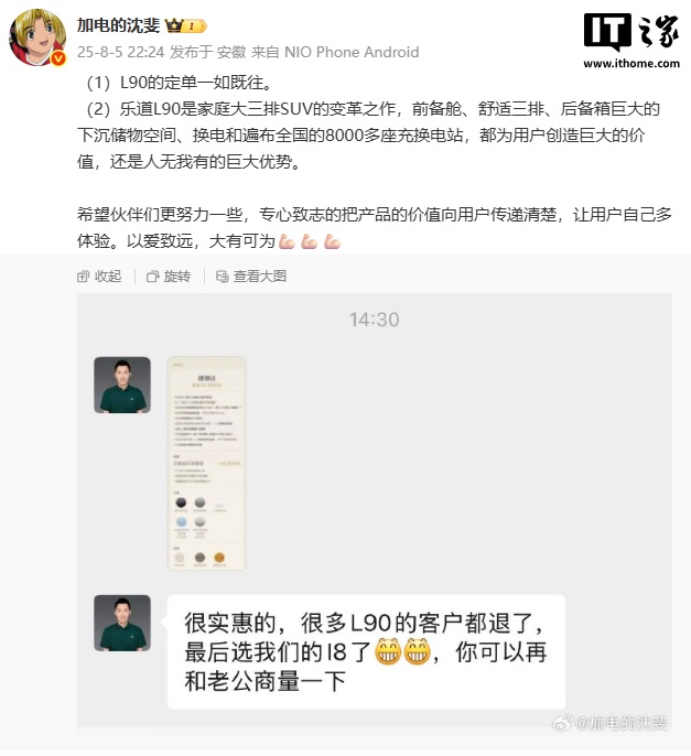 IT之家 8 月 6 日消息,昨日深夜,蔚来高级副总裁兼乐道汽车总裁沈斐在微博发了一张图,显示理想汽车销售人员劝客户退订乐道 L90 转下单理想 i8。