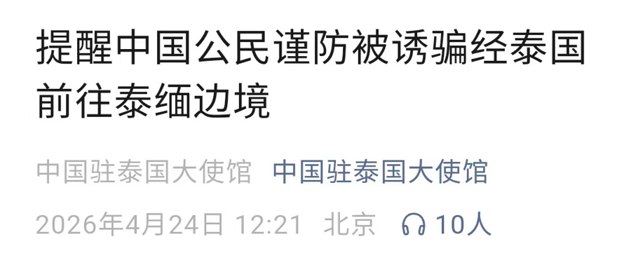 近期,多名中国公民被不法分子以“高薪招聘”、旅游观光等名义诱骗,经泰国前往泰缅边境后从事电信网络诈骗等违法犯罪活动,个别人员遭遇人身控制、暴力侵害和非法拘禁,严重危及生命安全和合法权益。