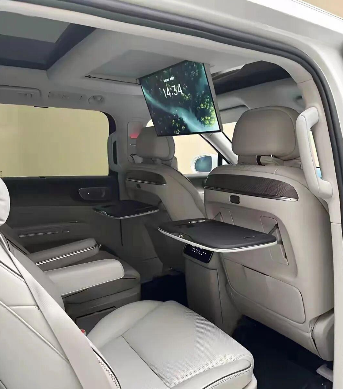 第2排座椅目前没有特别明显的细节,采用的依旧是独立座椅,两侧还有可以放下和展开的扶手。所以我们判断拍摄的这辆车应该是中低配车型,以D99的尺寸和定位来看,它肯定会推出独立航空座椅,甚至更高端座椅的版本。而最让人惊喜的就是它的第3排,它的第3排和MPV里面的绝大部分成员一样,也是三个座椅,重点在于它可以向前翻倒之后,连同坐垫直接向后再翻倒,变成一个纯平的接近于货车的结构。而且按照目前申报的消息来看,它的第3排座椅也可以自动调节,所以保不准会有一件收放座椅的结构。这么大的尺寸来看,这要是进行搬家或者搬运什么大件货物,那么完全可以将第2排座椅前移放倒第3排座椅,4人远途出行,后面所带的行李和其他物资远超于同类型同尺寸的 SUV车型。