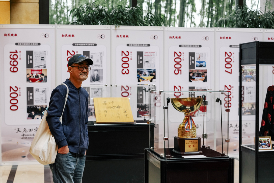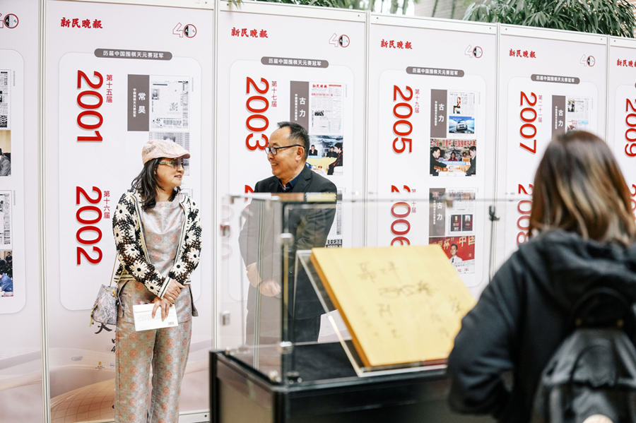 这四十年里,吕国梁以计时员、执行裁判长等不同身份参与天元赛,看着展墙上那些充满情感的文字和让人熟悉的照片,情不自禁地举起手机拍着,一张张照片、一段段视频不仅是赛事的资料,也是属于吕国梁的青春。“能在这些老版面上看到自己年轻时候的样子,我有些激动,仿佛回到了当初的岁月,有很多记忆像放电影一样在脑海中闪现。我要向新民晚报、天元赛和每一届的参与棋手表示感谢,感谢大家一起创造了这么美好的回忆。希望天元赛越办越好,参与者能更多地相聚。”他说。