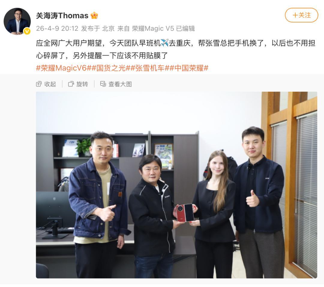 同样在4月9日,荣耀全球首席营销官关海涛发布微博称,“应全网广大用户期望,今天团队早班机去重庆,帮张雪总把手机换了。”