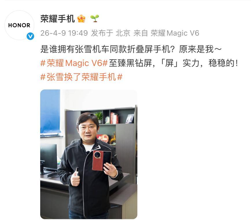 4月9日晚,荣耀手机官方微博发文:“是谁拥有张雪机车同款折叠屏手机?原来是我~”配图为张雪手持荣耀折叠屏手机。